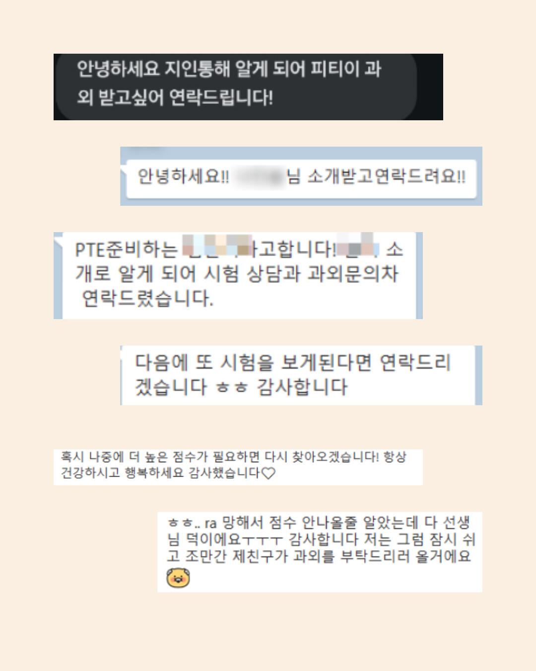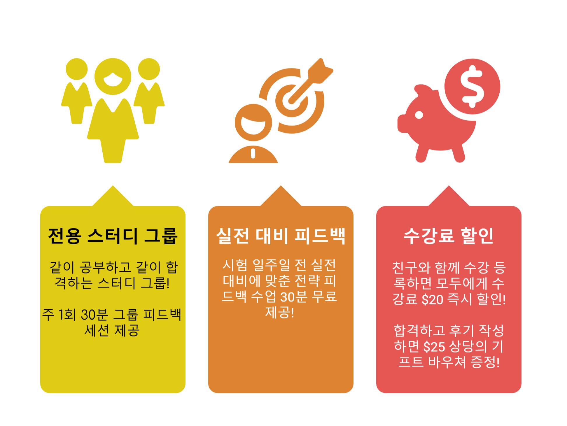 | 추천 대상 | 단기간 내 반드시 점수가 필요한데, 혼자 하기엔 어렵고 1:1 관리가 필요한 분 | PTE 공부가 처음이고, 3주 안에 모든 걸 끝내는 걸 목표로 하시는 분 | 유형은 혼자 정리했고, 발음 교정 / 공부 방향 OR 문제점 파악 관련 피드백만 받고 싶은 분 |
